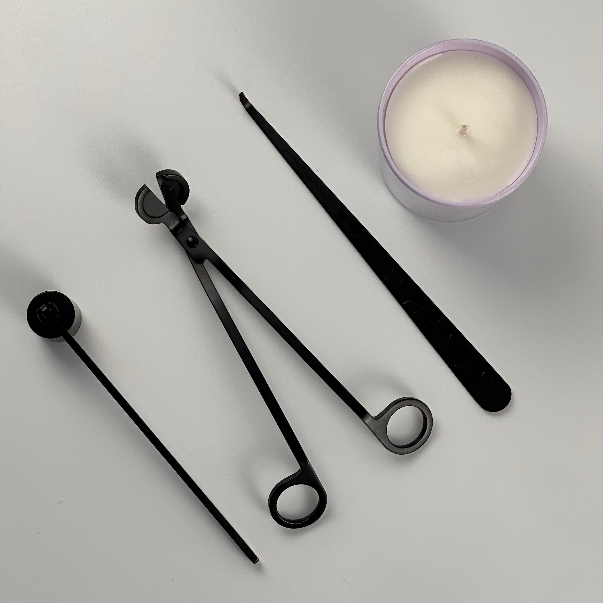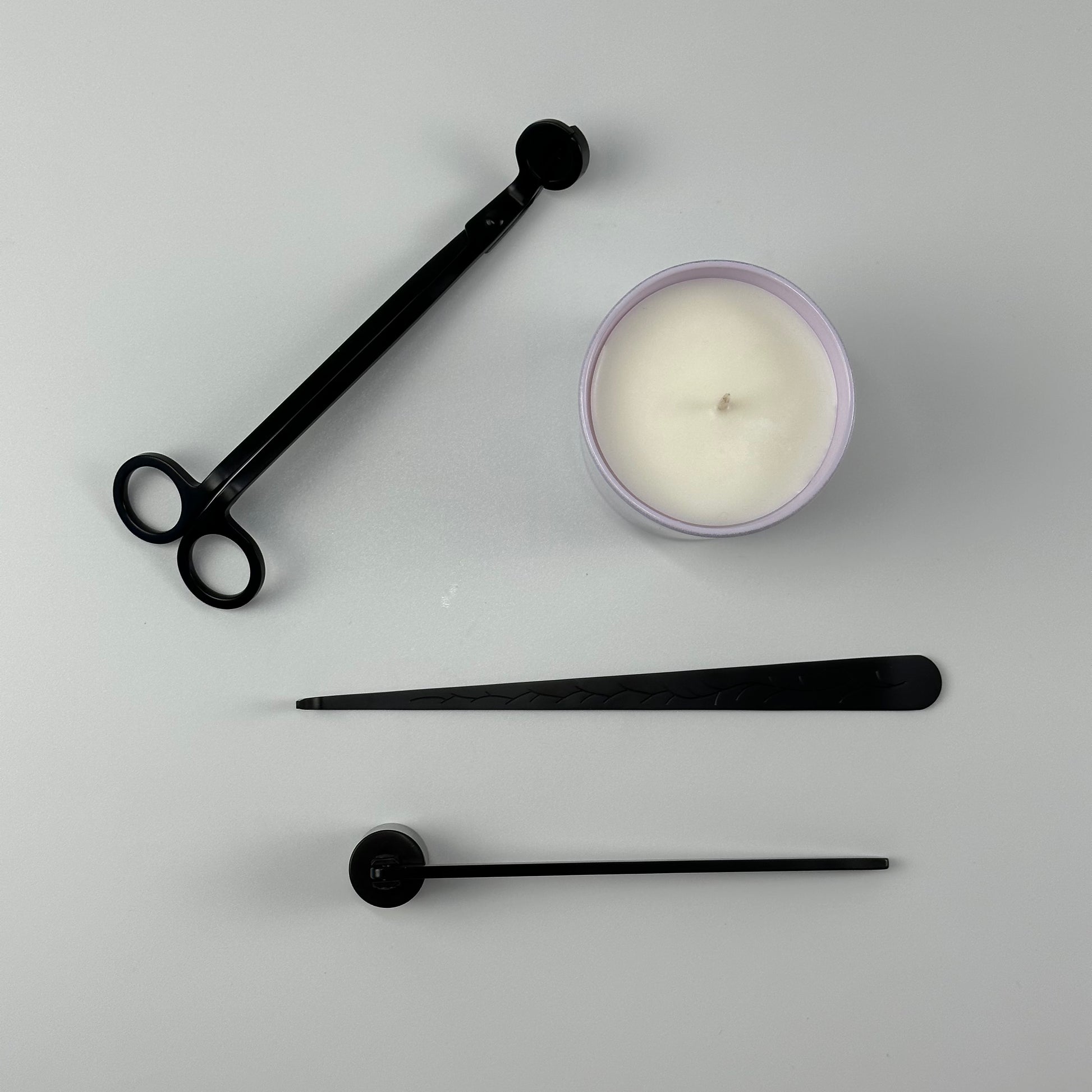 Підтримуйте яскраве горіння ваших ручних свічок із 100% соєвого воску за допомогою нашого чорного матового набору для обрізання ґноту, гасителя і гачка.