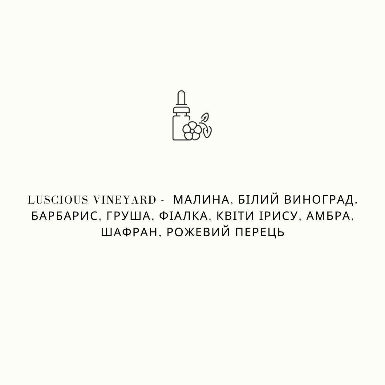 Малина, білий виноград, барбарис, груша, фіалка, квіти ірису, амбра, шафран, рожевий перець