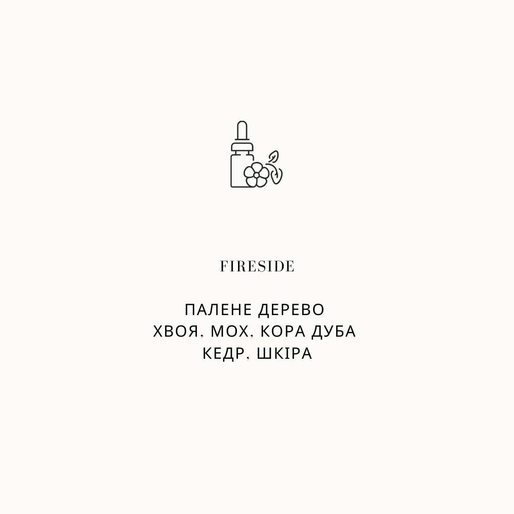 "Fireside" – це аромат, який втілює первісну магію вогню та зимової природи. Його потужні ноти диму створюють драматичну атмосферу, наповнену теплом потріскуючих дров і глибокою загадковістю. Свіжі деревні відтінки ялівцю, що яскраво розкриваються в дифузорі, додають пряної хвойної гостроти, нагадуючи про морозний вечір у засніженому лісі.