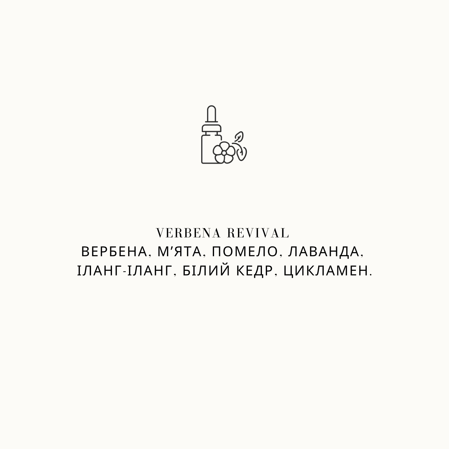 Бадьорий аромат щойно скошеної трави з нотами цедри і кедру. Мʼята привносить гармонію в композицію та збалансовує терпку вербену і солодкий іланг-іланг. Аромат активує творчу енергію і покращує настрій.